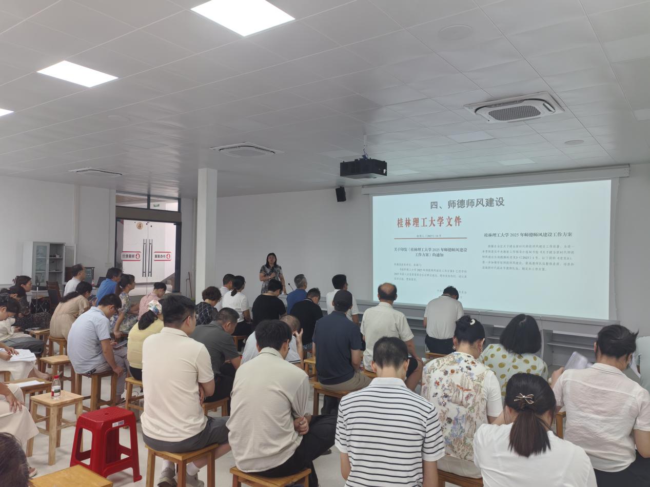 李霞副院长带领大家共同学习了《桂林理工大学2025年师德师风建设工作方案》、《桂林理工大学本科教学工作规范》、《桂林理工大学教学事故认定与处理办法》等文件,通报了一系列真实且极具代表性的案例,深入剖析了师德失范行为所带来的严重危害和不良后果,为全体教师敲响了警钟。她要求全体教师要以这些案例为镜鉴,时刻保持清醒的头脑,坚守师德底线,做到言传身教、率先垂范,以高尚的师德风范感染学生,努力成为学生成长道路上的引路人。