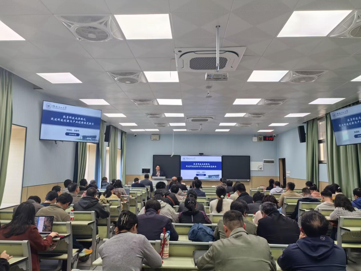 报告会最后,刘勇平分享了学校近年来科技成果转化的成功案例:朱万旭教授团队“自感知预应力锚具”应用于“中国天眼”和港珠澳大桥;周国清教授团队研制轻小型水深探测激光雷达,打破国外垄断;龙飞教授团队发明专利转让,建成全国首条透明膜专用碳酸钙生产线;张文杰教授团队厌氧氨氧化技术实现“碳中和”目标,入驻雁山智慧谷成立科技企业。这些鲜活的案例让在场教师深受鼓舞。