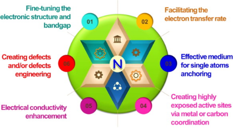电催化过程的能量转换效率的高低取决于催化剂的性能。随着氮原子掺杂策略的广泛应用,该方法在制备高效、稳定催化剂方面取得了迅速发展。最近已证明,氮掺杂策略能够调控暴露活性位点的电子密度,得到高性能电催化剂。在合成过程中,氮原子与裸碳、金属单原子、过渡金属氧化物、金属硫属元素化合物和MXenes上的局部原子配位之间保持强界面作用,这对于制备高效电催化剂方面起着重要作用。此外,氮原子与碳或金属原子结合的能力会受到合成条件的影响。本综述首次全面概述了含氮催化剂的合成策略对其化学、结构、物理电子性质的改变,以及如何影响其电催化氧还原(ORR)、析氧(OER)和析氢(HER)反应的性能。重点描述了如何利用特定策略来实现高效的电催化系统,包括掺氮催化剂的能量转换、结构调控和材料优化。最后,凝练了该方向在未来研究中面临的主要挑战。
