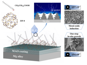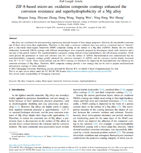 导航痕迹 当前位置: 主页 >> 科学研究 >> 学术动态 >> 正文 黑白直播官网 温玉清老师课题组在镁合金表面超疏水涂层领域取得重要进展 作者:温玉清 发布日期:2021-09-15 浏览次数: 近日,我校黑白直播 温玉清老师课题组在镁合金表面超疏水-防腐蚀领域取得重要进展。相关成果以ZIF-8-based micro-arc oxidation composite coatings enhanced the corrosion resistance and superhydrophobicity of a Mg alloy为题发表在《Journal of Magnesium and Alloys》(SCI一区TOP期刊,影响因子为10.088)期刊。该期刊是全球第一本专注于镁及镁合金的国际学术期刊,是“中国科技期刊卓越行动计划”金属材料与冶金领域唯一的国家领军国际期刊,位于全球SCI收录的冶金与冶金工程类学术期刊第1位。本研究得到国家自然科学基金、广西自然科学基金和广西电磁化学功能物质重点实验室基金等资助。我校黑白直播 硕士研究生蒋世权为论文第一作者,温玉清老师和尚伟老师为共同通讯作者,桂林理工大学为第一通讯单位。 镁合金因其独特的性能而被认为是最有前途的工程材料之一。然而,镁合金不易控制的高腐蚀速率限制了它的应用。因此,本研究采用微弧氧化层作为过渡层,在镁合金表面采用同源金属氧化物诱导和一步原位生长法制备了锌基金属-有机骨架(ZIF-8)复合涂层。该复合涂层显示出很强的疏水性和自清洁性能,在中性腐蚀性介质中的腐蚀速率显著降低,并从原理上探讨了该复合涂层的疏水保护机理。研究结果说明,ZIF-8复合涂层可以有效防止水和腐蚀性离子(Cl-)渗透到镁合金表面,有助于提高镁合金的疏水性和耐蚀性。 论文链接://doi.org/10.1016/j.jma.2021.07.027 论文发表情况 论文研究相关成果 上一条:黑白直播官网 刘勇平教授科研团队在(光)电催化领域取得重要研究进展 下一条:黑白直播官网 张云教授课题组在POCT研究领域取得重要进展