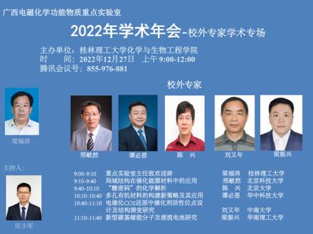 召开广西电磁化学功能物质重点实验室(以下简称重点实验室)2022年学术年会之校外专家学术报告会,会议全程线上进行。学校原副校长、重点实验室主任梁福沛教授出席并致辞。本次会议邀请了北京科技大学邢献然教授、北京大学陈兴教授、华中科技大学谭必恩教授、中南大学刘又年教授、华南理工大学梁振兴教授等五位专家做线上报告,会议由黑白直播官网