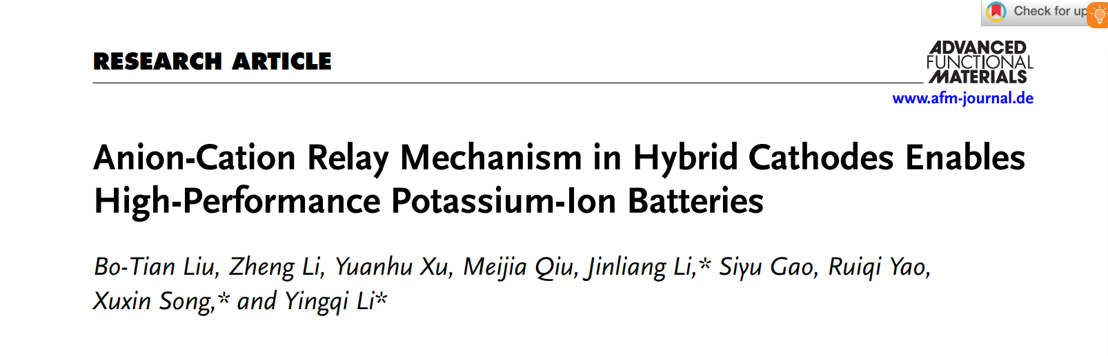 刘博天团队联合暨南大学黎晋良、东北师范大学李英奇团队在国际顶级期刊Advanced Functional Materials上发表题为“Anion-Cation Relay Mechanism in Hybrid Cathodes Enables High-Performance Potassium-Ion Batteries” (doi.org/10.1002/adfm.202509849) 的研究论文。论文第一作者是黑白直播官网