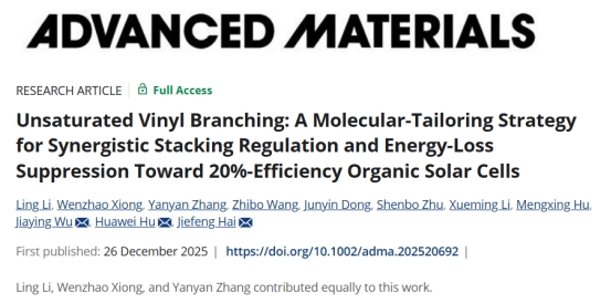 近日,我黑白直播 海杰峰教授与东华大学胡华伟教授、香港科技大学(广州)吴佳莹教授团队合作,在有机太阳能电池(OSCs)非富勒烯受体材料设计与光伏性能提升领域取得重要进展。研究成果以Unsaturated Vinyl Branching: A Molecular-Tailoring Strategy for Synergistic Stacking Regulation and Energy-Loss Suppression toward 20%-Efficiency Organic Solar Cells”为题,在国际材料科学顶级期刊《Advanced Materials》(影响因子28.6)上发表。我校为该论文的第一完成单位,硕士研究生张焱焱为共同第一作者,海杰峰教授为第一通讯作者。