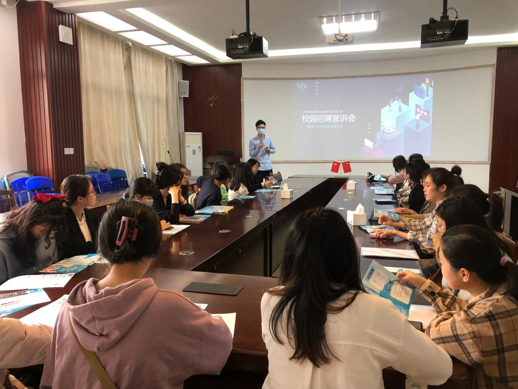 宣讲会开始,诺斯贝尔化妆品股份有限公司人事负责人就公司的发展概况、员工职业发展方向、人才招聘、人才培养等方面通过实拍图片展示、PPT展示等方式向同学们做了详细介绍。